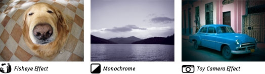 Monochrome Choose from three single-tone effects: Black-and-White, Sepia, or Blue.