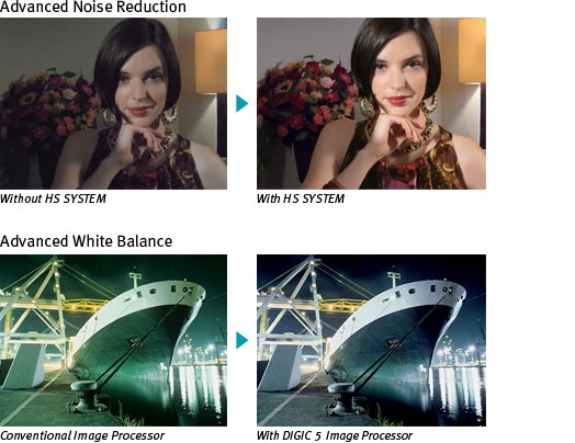 The latest-generation Canon DIGIC 5 Image Processor brings phenomenal increases in processing speed and power. Improved chip architecture and algorithms deliver greatly expanded functionality with further refinement in image quality. Improved noise reduction produces clearer images when shooting in low light at high ISO speeds. Enhanced i-Contrast performance adjusts differences between light and dark areas to achieve even more natural-looking results. The faster processing speed also results in faster continuous shooting capability while maintaining full image quality. The DIGIC 5 Image Processor also makes possible a new, highly advanced automatic white balance system. Whereas conventional white balance makes an overall adjustment based on a single type of light source, the new Canon Multi-Area White Balance analyzes several areas of the image to determine whether different adjustments are needed, for example, for the main subject and the background.