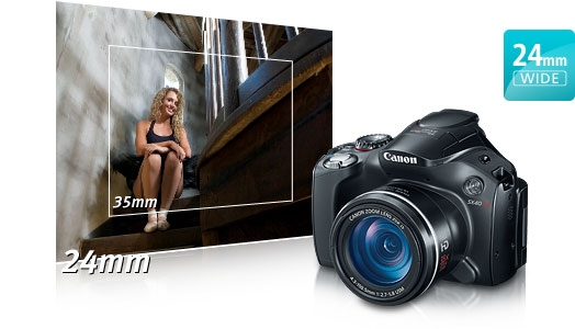 The PowerShot SX40 HS is equipped with a Genuine Canon 35x Zoom lens that provides the telephoto power to bring your distant subjects incredibly close. It also features a useful zoom range that begins at 24mm wide-angle and extends to 840mm telephoto (35mm equivalent). The 24mm ultra Wide-Angle allows you to create shots with dramatic perspective and makes it easy to shoot sweeping landscapes, large groups of people and tall buildings. This superb lens delivers outstanding optical performance throughout its zoom range. It's advanced design employs UD glass, double-sided aspherical glass-molded and ultra-high-refraction-index glass lens elements to effectively suppress chromatic aberration while maintaining a remarkably compact size. The camera uses a VCM (Voice Coil Motor) for high-speed, quiet, energy-efficient lens movement with precise control.