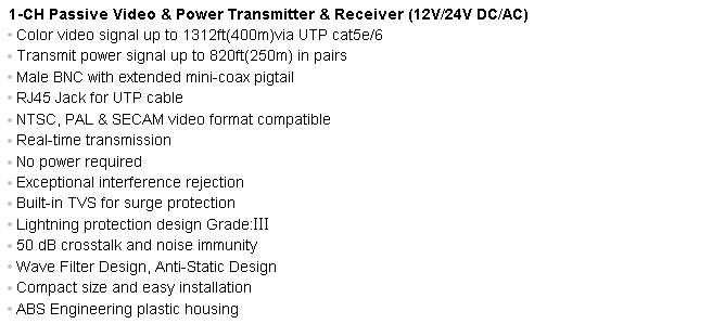 Single Channel Passive Video and Power Transmitter & Receiver |