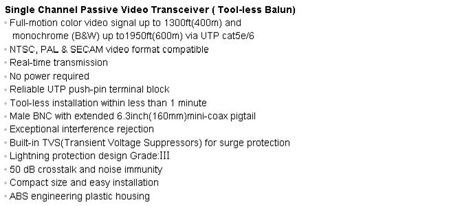 1-CH Mini Passive Video Balun with mini-coax pigtail lead Push pin terminal connection;too-less installation in less than 1 minute Built-in TVS for surge protection