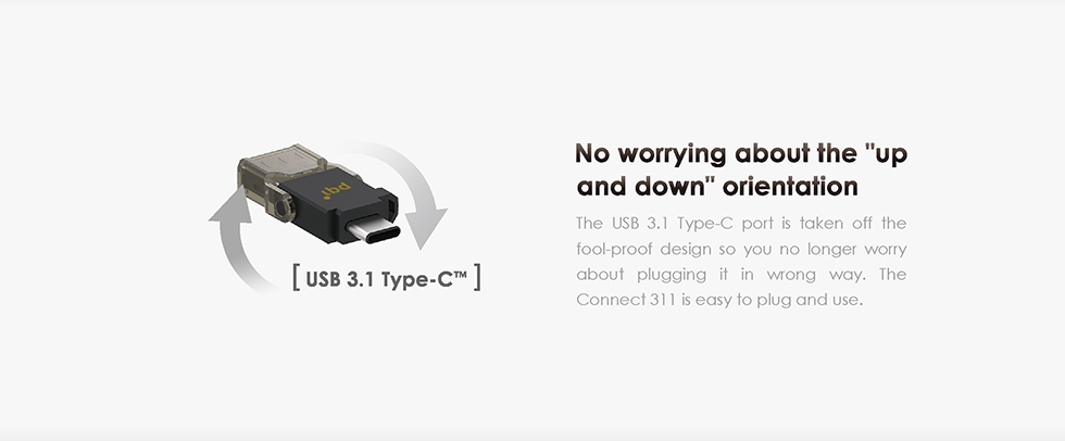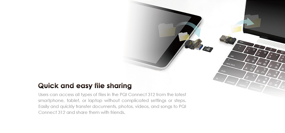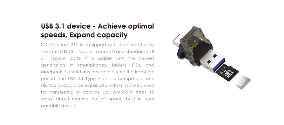 PQI Connect 312 has the latest USB 3.1 Type-C port that can be used on the newest generation of smartphones, tablets, laptops, and desktops equipped with the USB 3.1 interface for transferring or backing up files. Just insert a memory card into the other side of the standard USB 3.0 port and transform the device into a USB 3.1 Type-C storage device, as well as a dedicated flash drive for USB devices. PQI Connect 312 lets you easily transfer or back up files between new and old devices while solving problems such as running out of memory space or the inability to upgrade the built-in storage simultaneously.