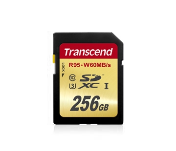 Transcend 256GB SDXC UHS-I Card - Class 3, Read 95MB/s, Write 60MB/s256GBTS256GSDU3 SDXC UHS-I U3 (R95, W60MB/s)In UHS-I compliant cameras, UHS-I Speed Class 3 (U3) cards are capable of recording video at a minimum constant write speed of 30MB/s. Yet, to support the demanding performance and storage space needed to capture smooth Full HD, 3D, and 4K videos, Transcend's SDXC UHS-I U3 cards offer maximum speeds of 95MB/s read and 60MB/s write, as well as extra large capacity of up to 256GB. Additionally, the top-tier MLC NAND flash chips inside provide consistent long-life durability and endurance. Features