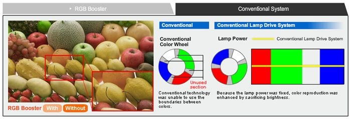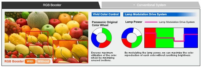 The RGB Booster achieves high image quality with levels of colour reproduction and brightness that make each colour stand out. It combines Panasonic's proprietary Vivid Colour Control technology with a newly engineered Lamp Modulation Drive System for a 1-chip DLP™ projector that produces bright and vivid colours.