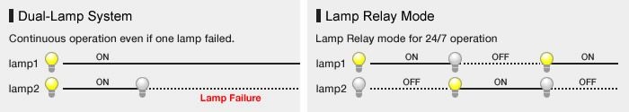 The Dual-Lamp System eliminates the need to interrupt a presentation if a lamp should burn out (in dual-lamp operation mode). The Lamp Relay mode also operates the lamps alternately to enable 24/7 projector operation.