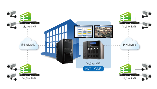 to 16 QNAP NVRs and 256 cameras and conduct central monitoring, playback, and