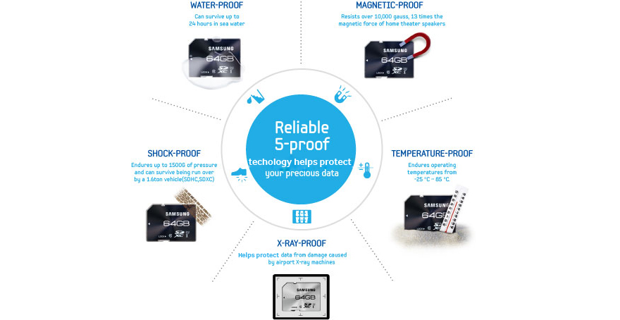 Reliable 5 Proof Technology protects your precious data Samsung Memory cards