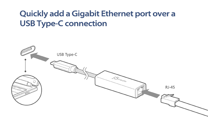 The j5create USB Type-C Gigabit Ethernet Adapter JCE131is a simple, one-piece external adapter that plugs into the USB Type-C port on your MacBook Air, Chromebook, and other laptop and desktop computers with a USB-C port. The JCE131 is the ultimate solution if you do not have an Ethernet port or if you just want to increase your speed. The elegantly designed JCE131 uses an RJ-45 connector that supports 10/100/1000 Mbps Ethernet performance. The JCE131 allows you to add networking capabilities to a computer without them through a Wi-Fi connection.