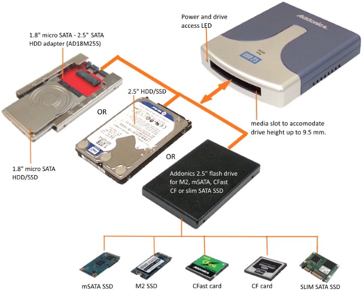 such as M2 card, mSATA SSD, CFast, CF or slim SATA SSD by using various Addonics