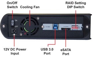 - RAID setting via software utility or via dip switches on the back of the unit