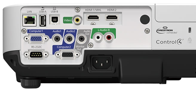 | Input: Video | 1 x RCA (Yellow) | | Input: Computer | 2 x D-sub 15-Pin (RGB), 1 x USB 2.0 type B | | Input: USB Memory Device | 1 x USB Type A | | Input: Three-In-One USB Display | 1 x USB 2.0 type B | | Input: Digital | 2 x HDMI (1 x MHL) | | Input: Audio | 1 x RCA (Red/White), 2 x Stereo mini jack | | Input: Control | 1 x USB 2.0 type B, 1 x RS232C | | Input : HDBaseT | NA | | Input: Epson USB Document Camera | 1 x USB 2.0 type A | | Network I/O: | 1 x RJ45 (100Mbps) | | Wireless Connectivity | Included | | WiDI/Miracast | NA | | Output: Video | 1 x D-sub 15 pin (black moulding) | | Output: Audio | 1 x Stereo mini jack | | Speaker Output | 16W | | ADVANCED FEATURES |