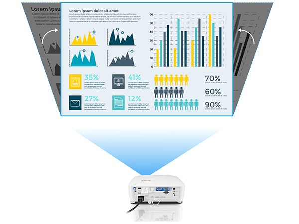 Countering the trapezoid effect when the projector must be placed off-center, such as simple placement on top of a table, vertical keystone function adjusts the image for a professionally squared image. Keystone correction makes it easy to project ideally aligned images from a variety of locations.