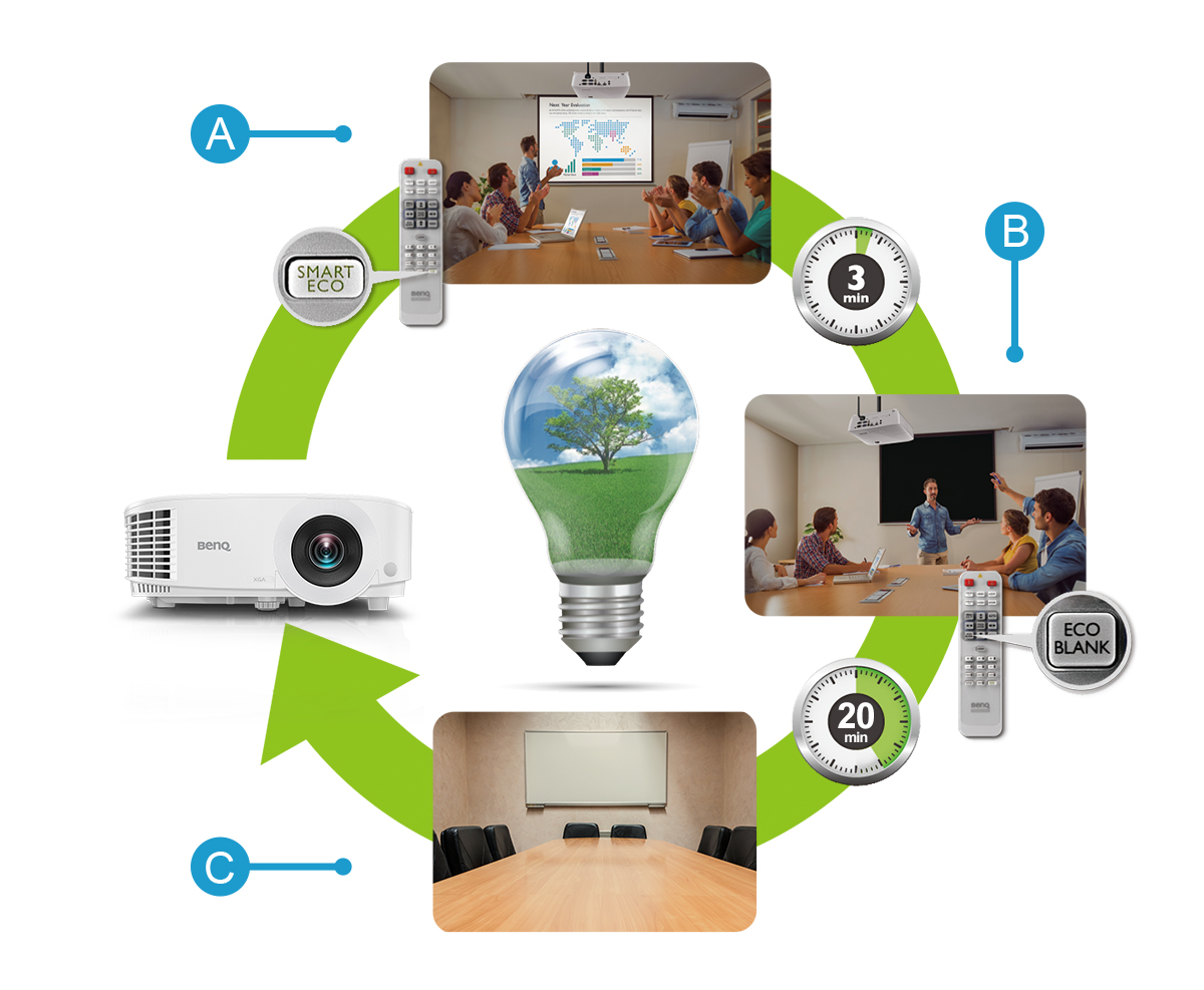 The BenQ Eco Cycle System eliminates electricity waste, reduces power-up wait time before and after meetings and minimizes maintenance for lower total cost of ownership.