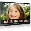 The Smart Gesture UI makes managing your photos a very moving experience. Its built-in acceleration sensor turns your gestures into commands. Just tilt it to one side or the other to scroll through your photos without even pressing a button! Don't like how a photo came out? Just draw an "X" on the screen or rotate it and poof! it's deleted. Easily change modes and create slideshows simply and button-free.