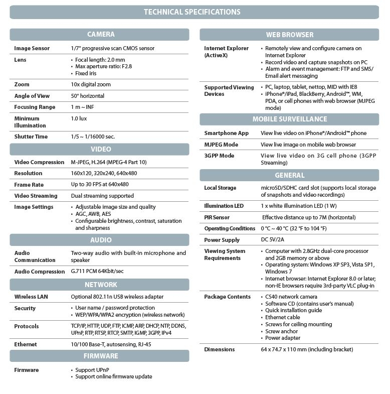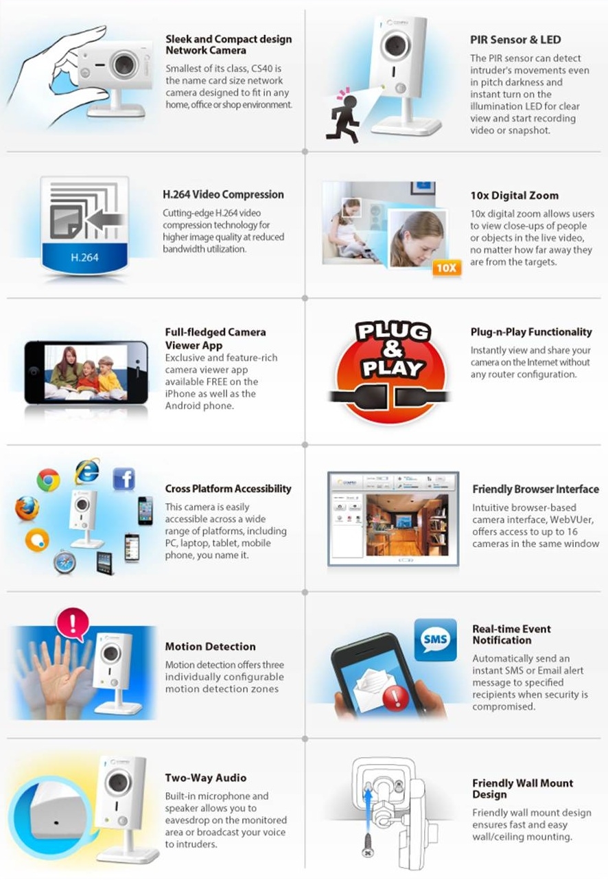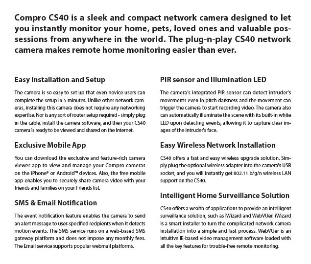 Compro CS40 Indoor Day & Night VGA IP Camera, H264, 2-Way Audio, LED/PIR, MicroSD, Wireless Upgrade