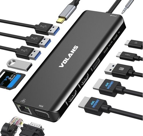 Volans VL-UCTDMH-S2, 14-in-1 USB-C Hub Compact Dock with 100W Power Delivery, Triple Display Support, 2xHDMI 2.0 (1x4K 60Hz, 1x4K 30Hz), 1xVGA, 3xUSB-C, 4xUSB-A, 3.5mm Combo Jack, GbE, SD/MicroSD Reader,
